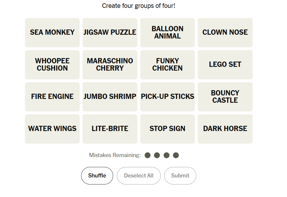 Today’s puzzle was playful from start to finish — a mix of color, air, assembly, and animal flair. It reminded us that Connections isn’t just about knowing words; it’s about seeing patterns in the everyday. If you balanced your categories without tripping over that “funky chicken,” consider yourself a pro! Tomorrow’s grid promises new surprises — so take a deep breath (but maybe not from a whoopee cushion) and get ready to connect again!