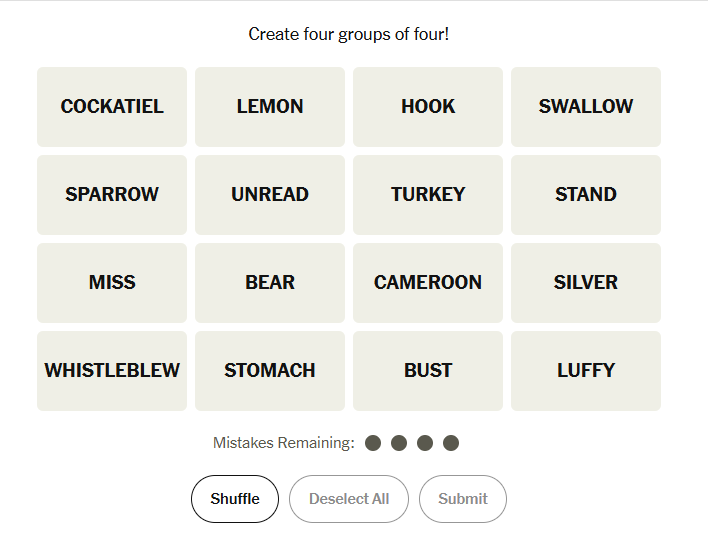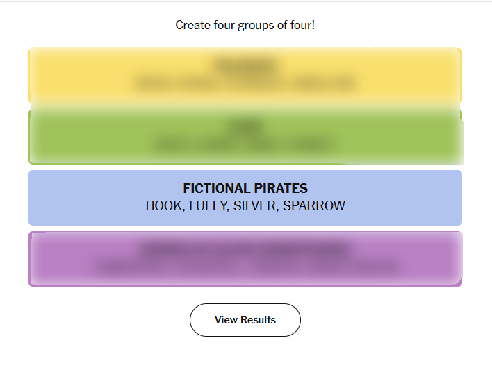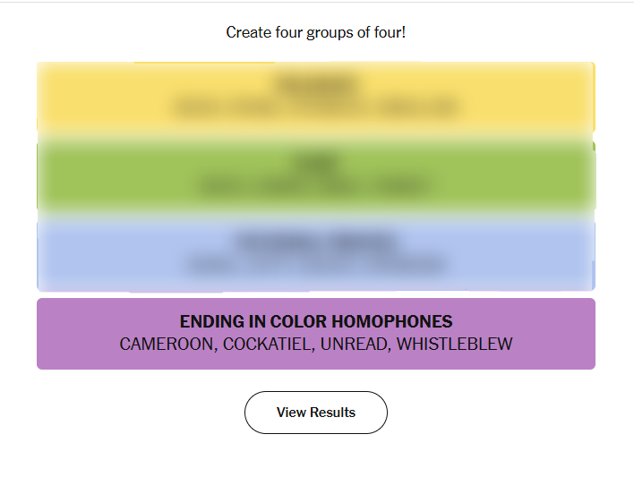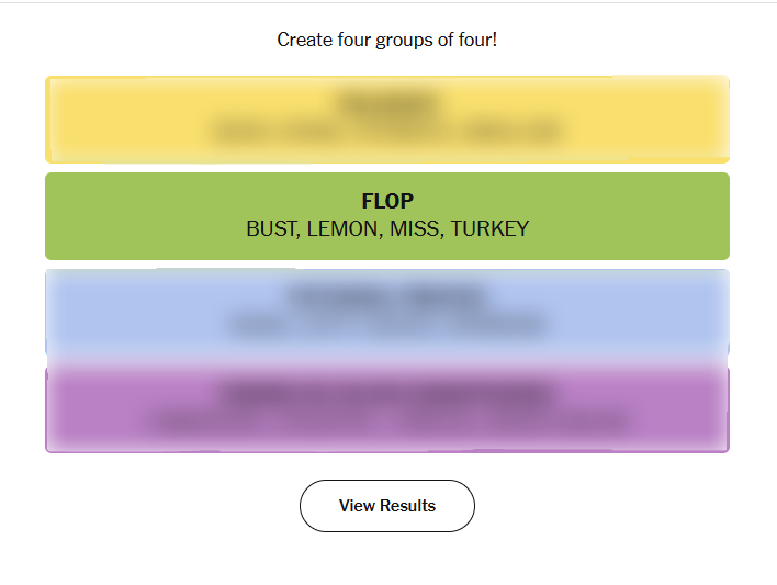 This was a satisfying puzzle that balanced accessibility with intellectual challenge. The Green category clicked relatively quickly once the failure theme emerged, and Yellow followed suit with a bit more mental flexibility required. Blue delighted pop culture enthusiasts with instantly recognizable names. The Purple category remained the true puzzle—seemingly random words until their phonetic patterns aligned with color homophones, transforming confusion into triumph.