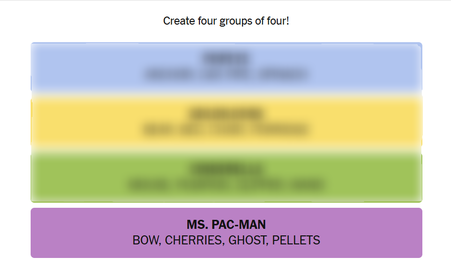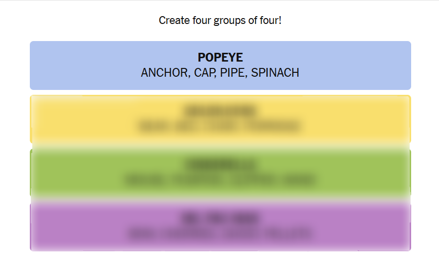 This puzzle thrives on well-known stories and iconic characters, making it approachable and fun. Start by identifying the bear family and Goldilocks group, thanks to the distinct names and familiar narrative. Cinderella’s magical elements come next, followed by Popeye’s cast symbolized by spinach and his love rivalry. Finally, Ms. Pac-Man’s arcade-themed set rounds out the puzzle with recognizable gaming terms.