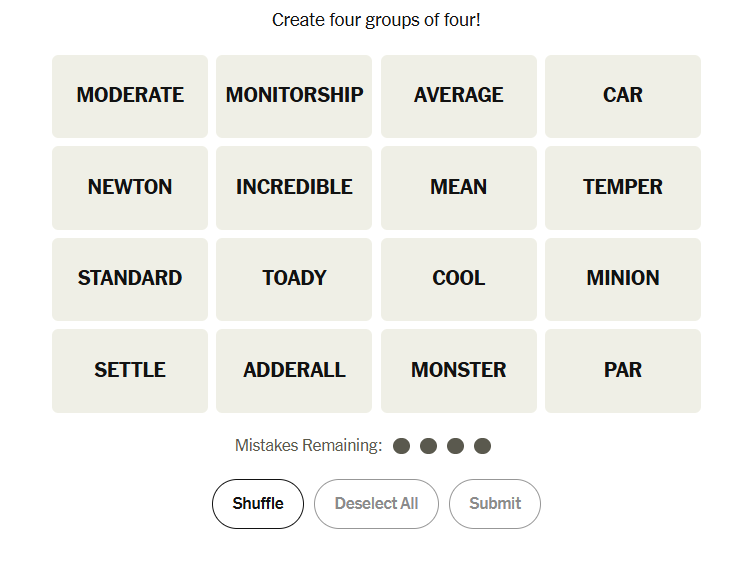 Today’s puzzle balanced obvious synonym clusters with two clever sets that played on word structure and pop-culture titles — a satisfying mix of easy and “aha” moments. Quick strategy tip: clear the pure-synonym groups first to free mental bandwidth, then test short prefixes and title-based possibilities on the remaining words.