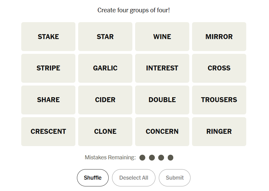 Today’s grid leaned heavily into concepts and associations rather than literal definitions. A couple of categories appeared deceptively obvious, while one relied on a playful linguistic twist. Overall, this was a satisfying mix that rewarded broad knowledge and careful reading, especially for solvers who double-check patterns before locking answers.