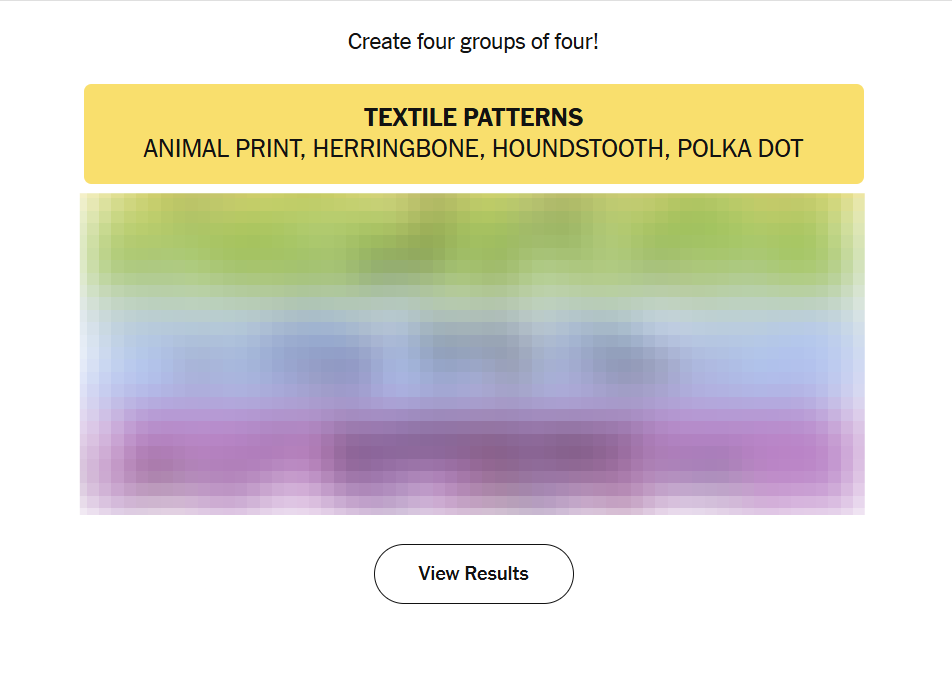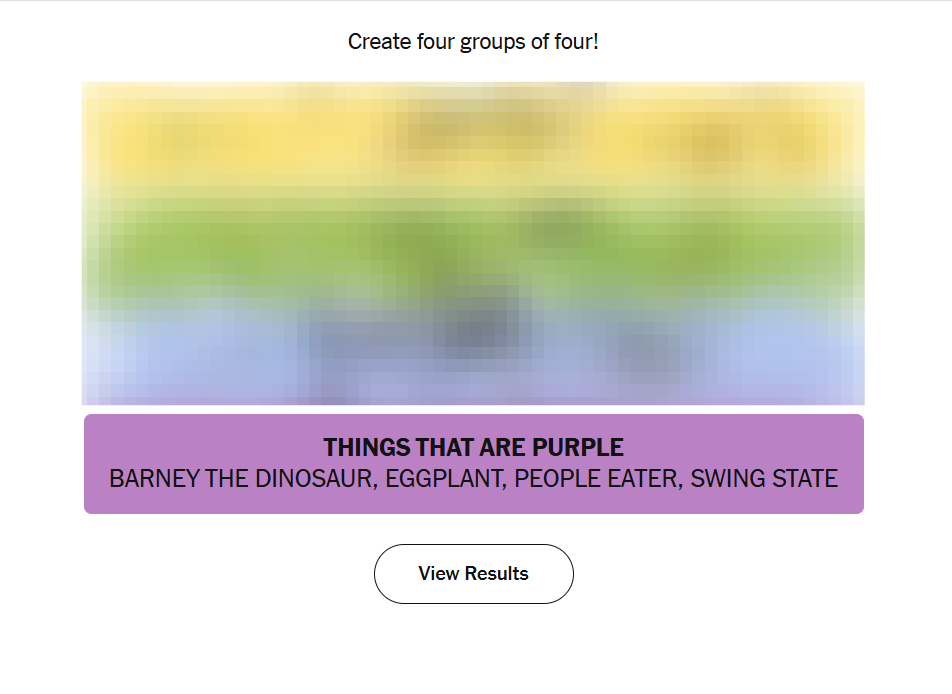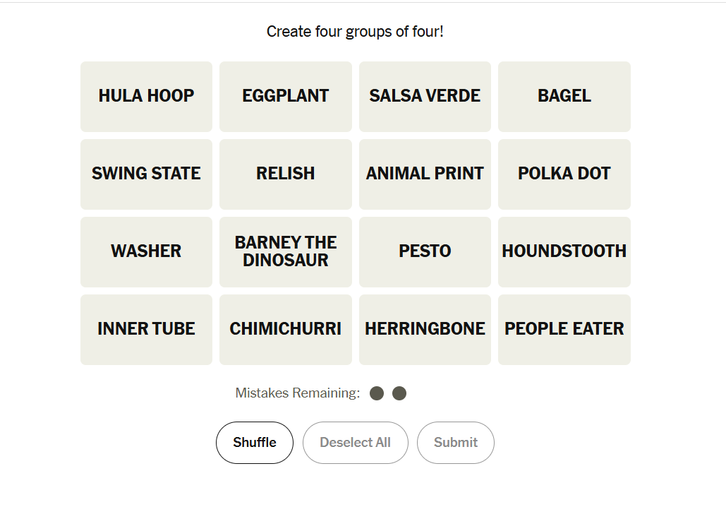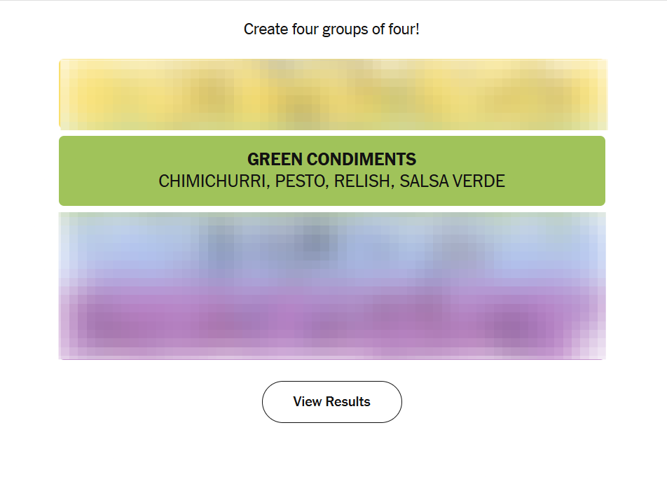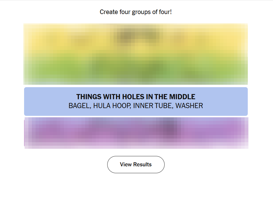 This puzzle rewards visual thinking: lock in the textile and hole-in-the-middle groups first—they’re the most image-driven. The green-condiment set is culinary and distinctive; the purple group is pop-culture + politics, so say those clues aloud if they feel fuzzy.