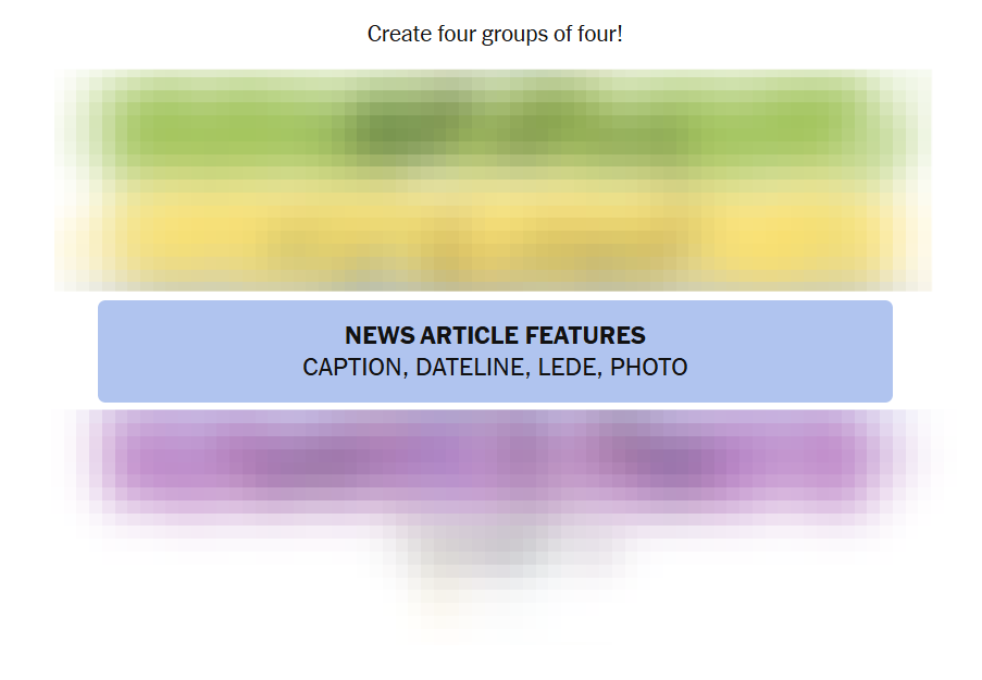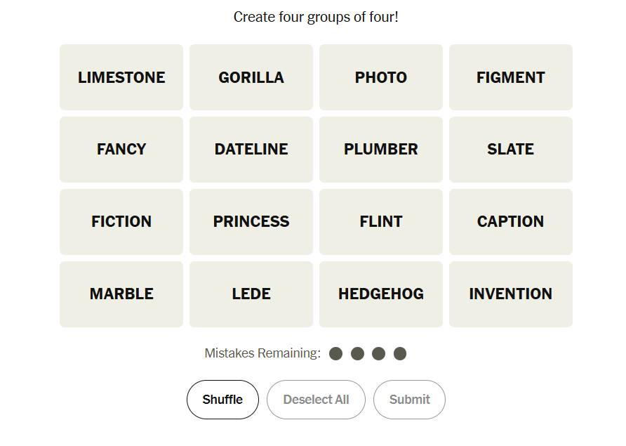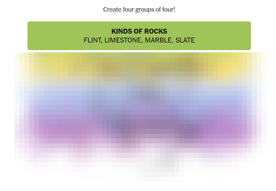 This puzzle is comfortable and clever — four tidy categories that reward both picture-thinking and a little word awareness. Two groups are deeply literal (rocks and news features), one is pure imagination, and the last is a nostalgic gaming nod. Spot one obvious member, build momentum, and the rest falls into place. You’re faster than you think — click with confidence.