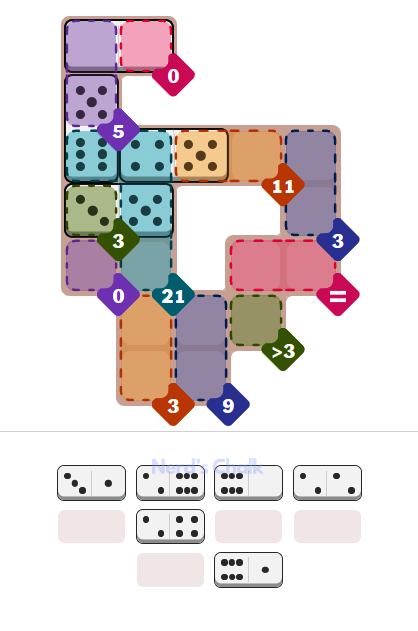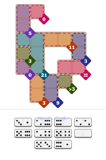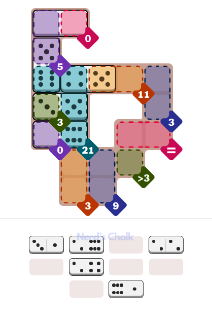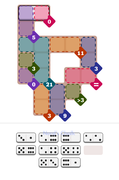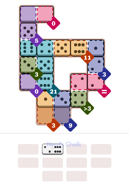 - Greater-Than or Less-Than (e.g., “>3”, “<13”): Every half-domino lying in that region must have a pip count above or below the specified number.