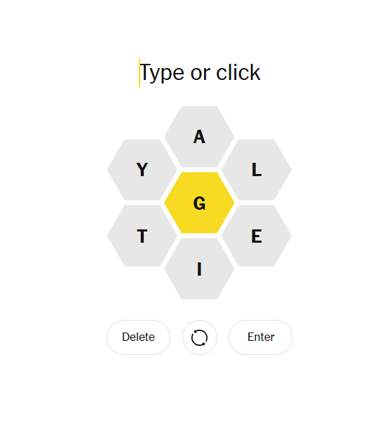 Center letter G anchors the hive, surrounded by A, L, E, I, T, Y. It’s vowel-friendly with A, E, and I, yet consonants L, T, and Y steer choices toward certain stems. The puzzle felt moderately open — plenty of smaller finds, but obvious stacks require second looks to surface.