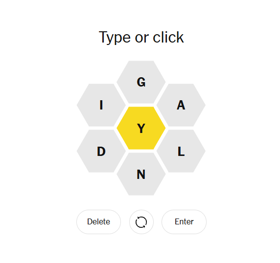 The day’s longest, dallying, works because it contains every letter in the hive: D, A, L, L, Y, I, N, G. As a gerund it naturally uses the double L and the Y ending while folding in both G and N, letters that can be tricky to place. It’s a vivid verb — meaning dawdling or lingering — and makes a satisfying final find.