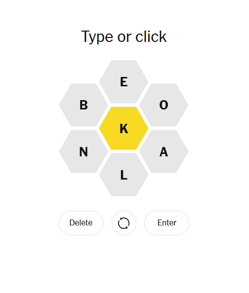 Center letter K shapes every answer today. The hive mixes three vowels (A, E, O) with consonants B, N and L, so you get both vowel-focused endings and solid consonant bases. The puzzle felt moderately open — many common roots exist, but the K requirement narrows options and rewards thinking of kn- and k-combinations.