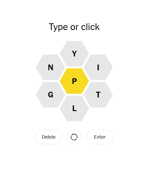The hive for today buzzes with intensity and precision. With P at the center and a sharp mix of Y, I, T, N, G, L, this one feels like a riddle that tests your focus — soft yet piercing.