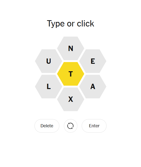 The hive letters T, E, X, N, U, A, L come together beautifully to form sleek, modern, and almost musical words. Here’s a taste of what today’s grid offers: