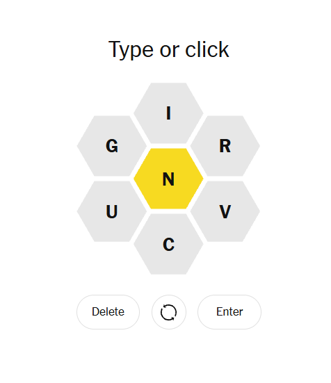 Center letter N forces every answer to tie back to that consonant. The outer letters (I, G, R, U, V, C) create mostly consonant-heavy options with a single vowel, so the hive feels focused but not closed — there’s scope for verbs and gerunds, plus a few multi-N words that expand the list.