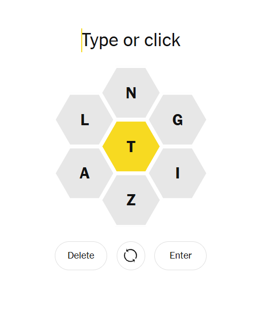 Today’s hive puts T in the center with the surrounding letters N, G, I, Z, A, L. It’s a tidy, energetic set that rewards players who anchor on T, then stretch into longer builds. Expect quick four-letter wins and a handful of juicy longer finds if you keep nudging letters together.