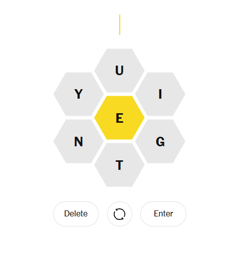 Today’s hive centers on E, surrounded by a generous blend of vowels (U, I, Y) and a few useful consonants (N, G, T). This mix makes the puzzle feel broad but not overwhelming. With several pathways into longer constructions, the grid leans more open than restrictive, especially once you start linking the consonant endings with the flexible vowel options.