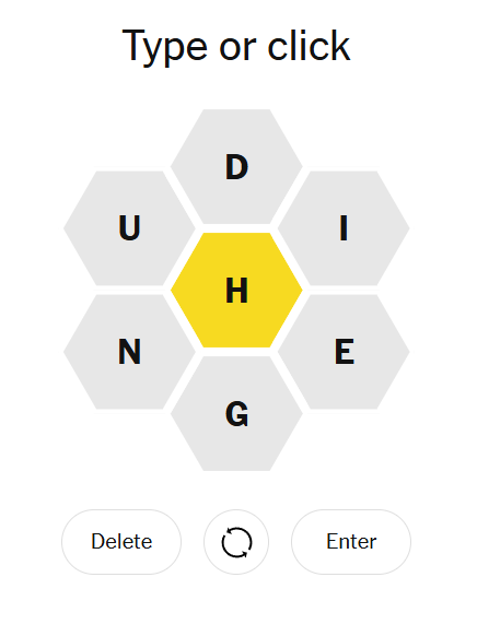 Today’s hive centers on H, surrounded by D, E, G, U, I, N. It’s a compact, nicely balanced set — a few short, clean words to get you started and a very satisfying pangram that rewards the patient builder.