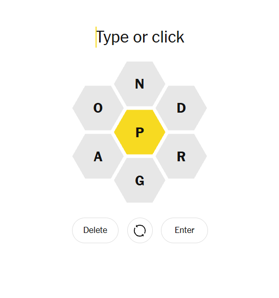 With P as the mandatory center letter, the hive leans on a balanced mix of consonants—N, D, R, G—with supporting vowels A and O. This combination feels moderately open, though the heavier consonant presence adds a slight challenge. Many words branch from common prefixes and endings, rewarding players who test variations and sound-based guesses.