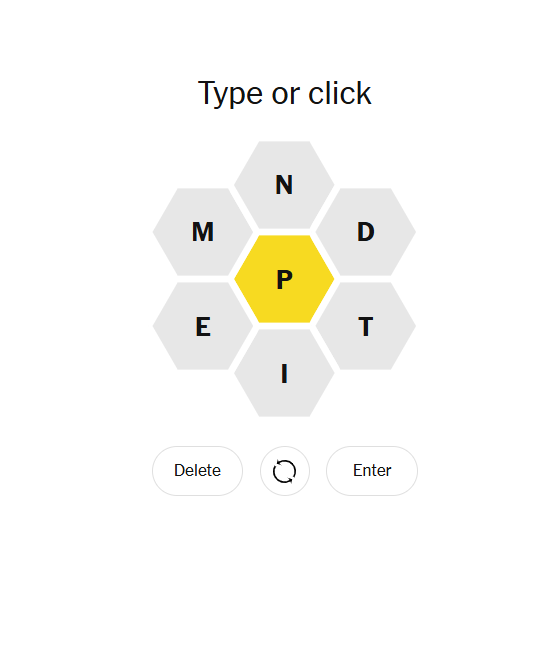 Today’s hive is compact and precise: every valid word must include the center letter P and be made only from the seven letters shown. This set favors words built from steady stems and repeated letters — it rewards careful rearranging rather than wild guesswork. Start with short anchors and build outward; the grid opens up quickly once you find a few dependable stems.