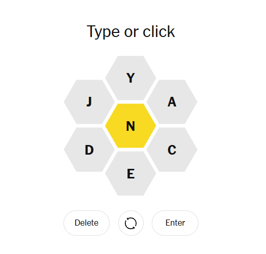 With n locked in the center, this hive leans heavily on repeats and word extensions. The mix of a, c, d, e, y, and j gives you some friendly building blocks, but also limits flashy options. It feels moderately restrictive, pushing solvers toward longer, layered words rather than lots of quick hits.