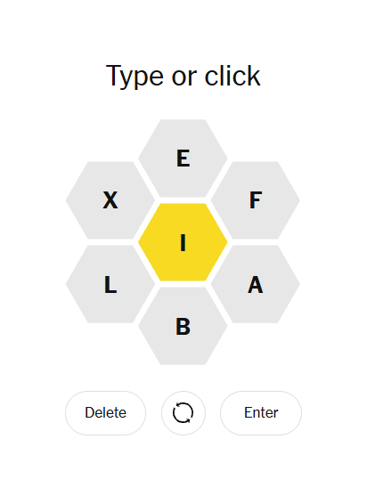 This hive centers on the letter I, surrounded by E, F, A, B, L, and X. The mix creates a semi-open grid: plenty of vowel support but also tricky consonants like X and F that narrow options. Still, the balance between flexible A/E vowels and the stronger consonants makes the puzzle feel fair, offering steady progress once you find the right word patterns.