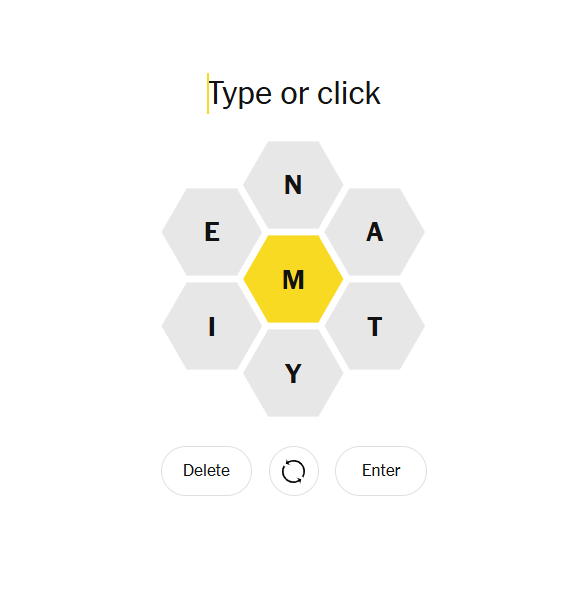 Today’s hive is compact and rhythmic. With M at the center, the grid encourages building from small, reliable stems into longer combinations. It’s the sort of puzzle that rewards steady attention and gentle experimentation — try short anchors first, then stretch them with available vowels and the Y for extra endings.