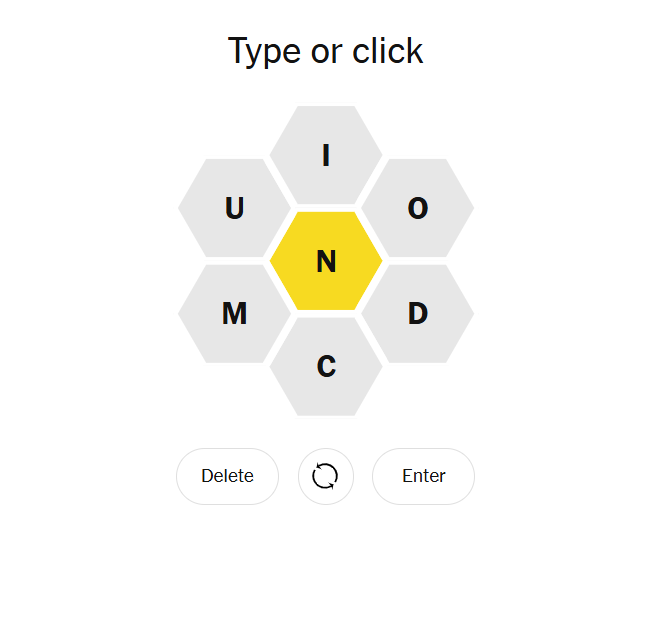 Nice hive today — N is in the center, with U, I, O, M, D, C around it. That cluster rewards players who anchor on N and then stretch into longer builds. Expect a mix of everyday finds and some pleasantly nerdy longer words.
