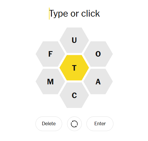 With T sitting in the center, this puzzle leans on smooth vowel connections from A, O, and U, balanced by firmer letters like F, M, and C. The grid feels open early on, but longer words demand careful recycling of letters rather than easy expansions.