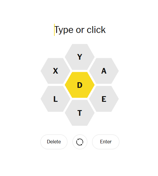 The hive centers on D, with an unusual blend: the rare X plus vowels A and E, and consonants L, T, Y. That X makes some common routes unavailable, but the two vowels and flexible letters keep the puzzle feeling open enough for varied word lengths rather than strictly restrictive.