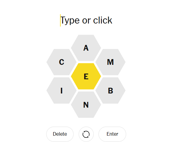 The center letter is E, surrounded by A, M, B, N, I, and C. That gives two vowels (A, I) and several consonants that form useful pairs (M/N, B/C). Overall the hive felt open enough to find many common words, but also picky — several tempting prefixes won’t work without that required E.