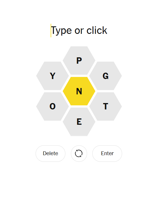 Word puzzlers, welcome back! Today’s hive is centered on N, with P, G, T, O, E, Y as the surrounding letters. It’s a balanced, energetic puzzle: plenty of short words to get your fingers warmed up, and a beautifully layered pangram hiding in the mix.