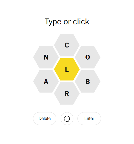 Center letter L forces every word to pivot around that consonant. The surrounding mix — C, O, B, R, A, N — combines a couple vowels with several consonant clusters, making medium-length words common but truly long finds rarer. Overall the hive felt moderately open for 4–6 letter plays but restrictive for many longer options.
