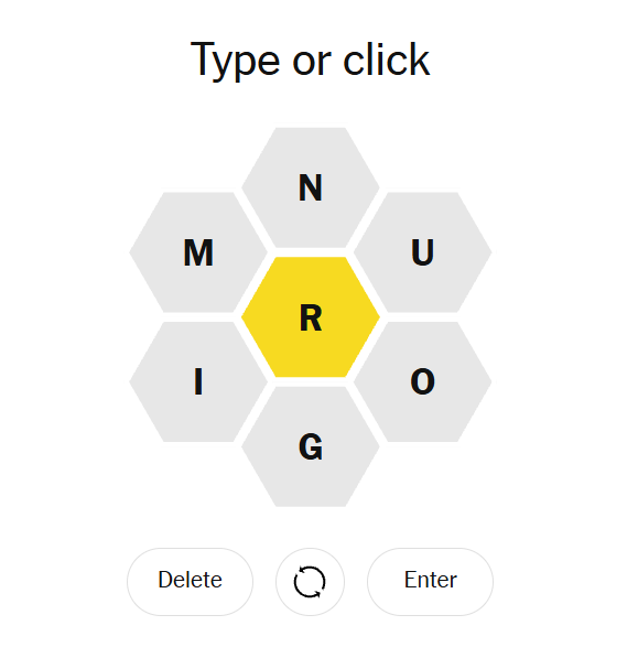 With R locked into the center, today’s hive encourages looping, rolling words. The mix of consonants like M, N, and G pairs nicely with the vowels, creating room for repeated-letter constructions. Overall, the puzzle feels fairly open, especially if you’re comfortable spotting “-ing” endings and compound-style builds.