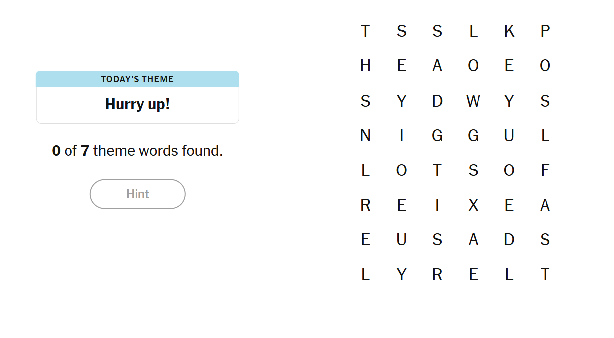 The goal is to find 7 theme words hidden in the grid. All the words relate to the idea of moving quickly or urging speed.