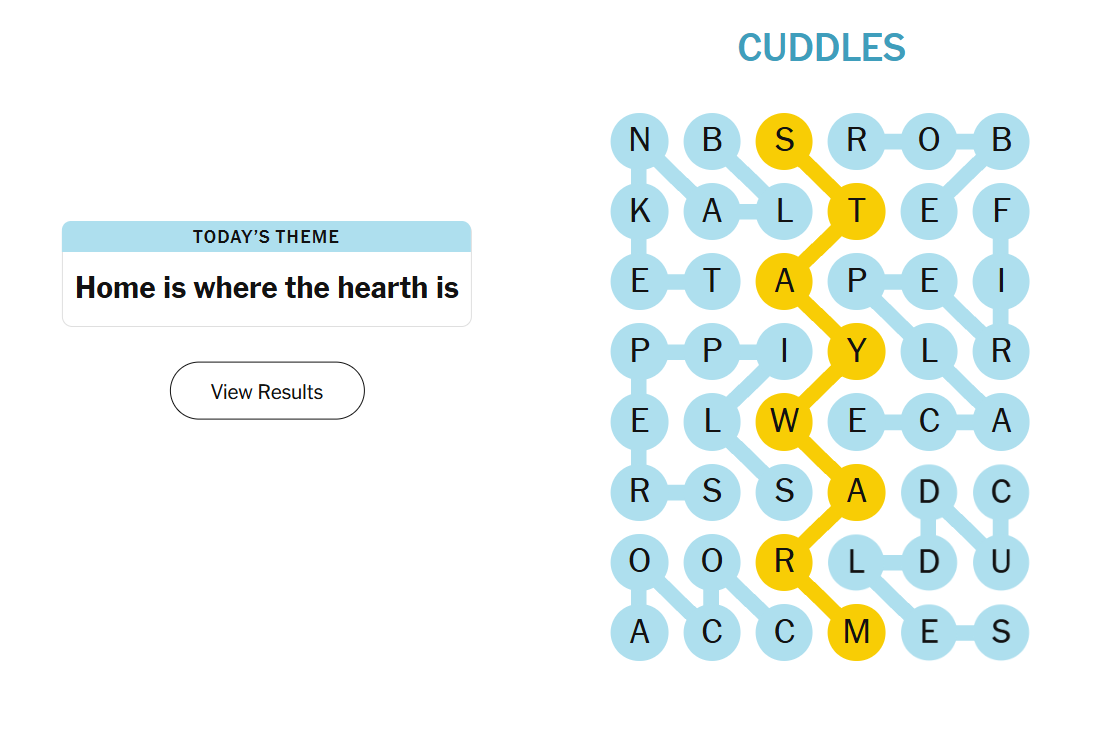 This theme centers on warmth, comfort, and those little things that make home feel safe and relaxing. The puzzle feels especially fitting for winter, with familiar, soothing words that are easy to recognize once the theme clicks. The spangram is pleasantly straightforward and reinforces the cozy mood without being overly long or tricky.