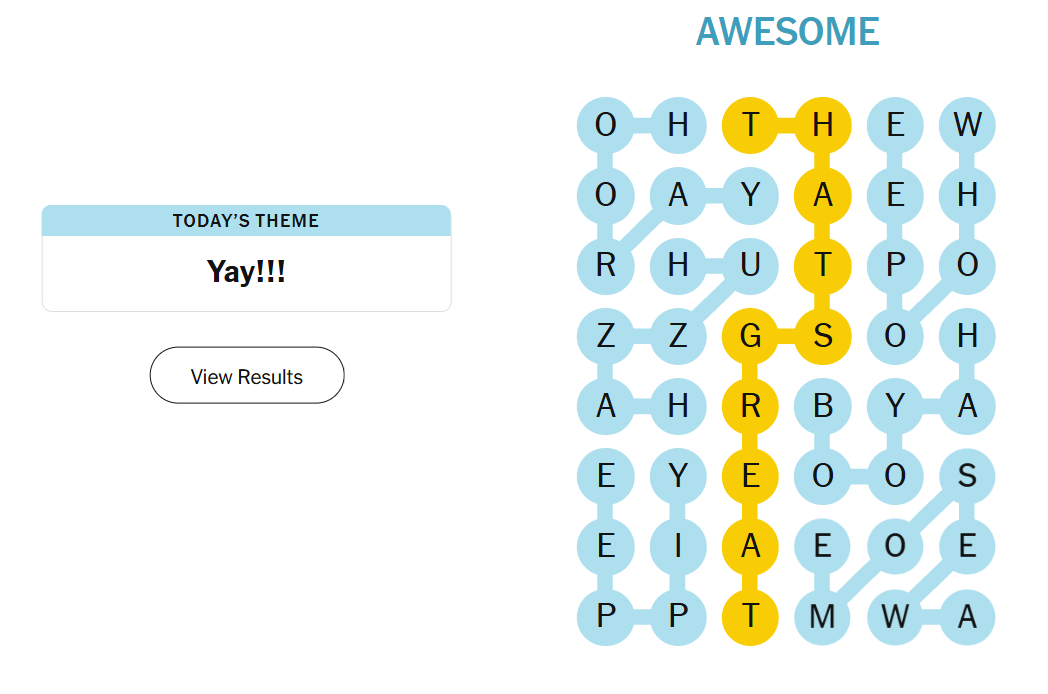 This theme was pure positivity. Every word in the puzzle reflected excitement, approval, or celebration. The vocabulary was familiar and lively, making the puzzle feel lighthearted, with the spangram tying all those happy reactions together in a playful way.