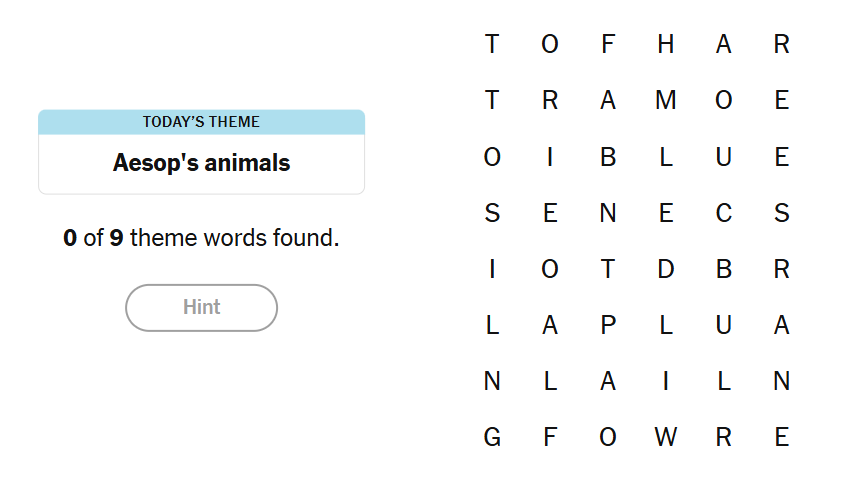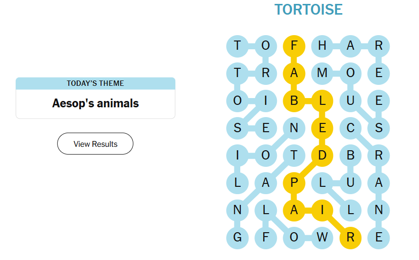 Today’s puzzle played friendly for anyone familiar with Aesop’s cast — moderate in difficulty, with reassuringly familiar vocabulary and a pleasant spangram that tied everything to the world of fables. How many did you find?