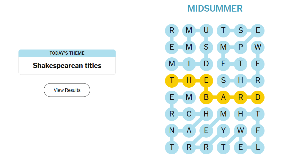 This spangram links all the theme words by pointing to William Shakespeare—famously known as “The Bard”—whose plays formed today’s puzzle.