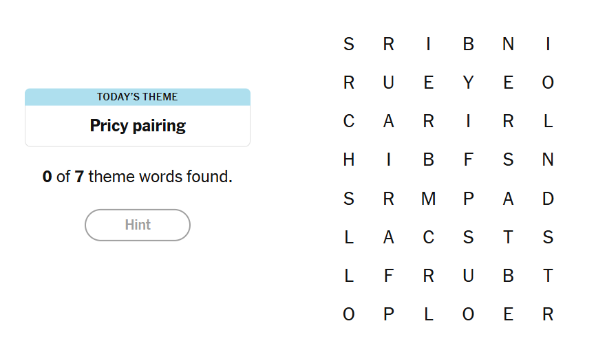 The “Pricy pairing” theme leaned into luxury dining, pairing high-end meats with seafood staples you’d expect on an upscale menu. The puzzle felt approachable, with familiar words, but still required careful scanning to separate similar food terms from overlapping letters.