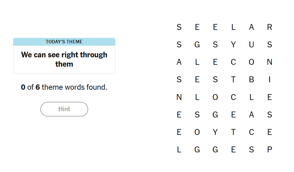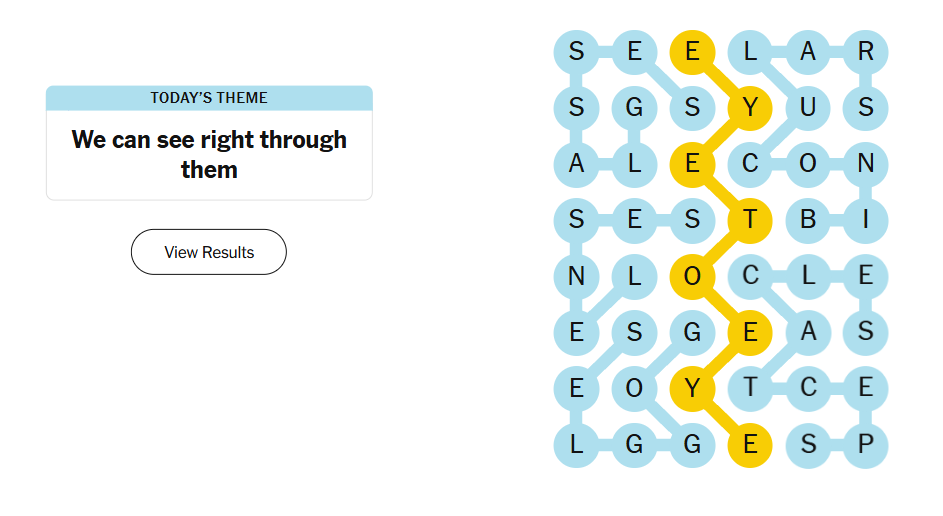 Today’s Strands puzzle centered on transparent and vision-related objects — a straightforward theme with familiar items. The constructor favored common optics vocabulary, so most answers felt natural; the spangram nicely tied the list together with a short, evocative phrase.