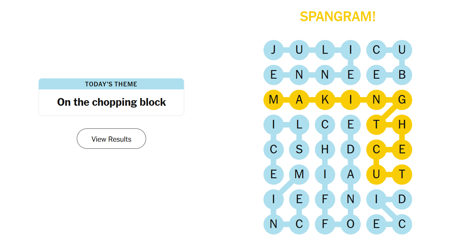 Today’s theme focused on cutting techniques you’d typically hear in a kitchen. The puzzle felt cleverly constructed, with a mix of short, snappy words and longer, more technical ones. The spangram itself was fairly long, but once you spotted it, the rest of the grid started to fall neatly into place.