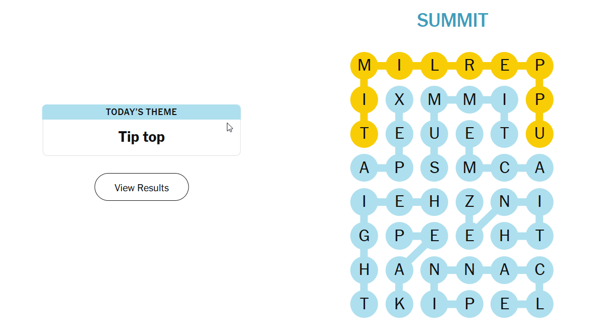 This "Tip Top" theme celebrates the vocabulary of achievement. The constructor favored synonyms for the highest point and peak performance, creating a vertically-oriented puzzle that feels like climbing toward the top. Expect a mix of descriptive terms that all point toward reaching maximum height, quality, or standing. The spangram ties it all together with a phrase that captures the boundary of achievement.