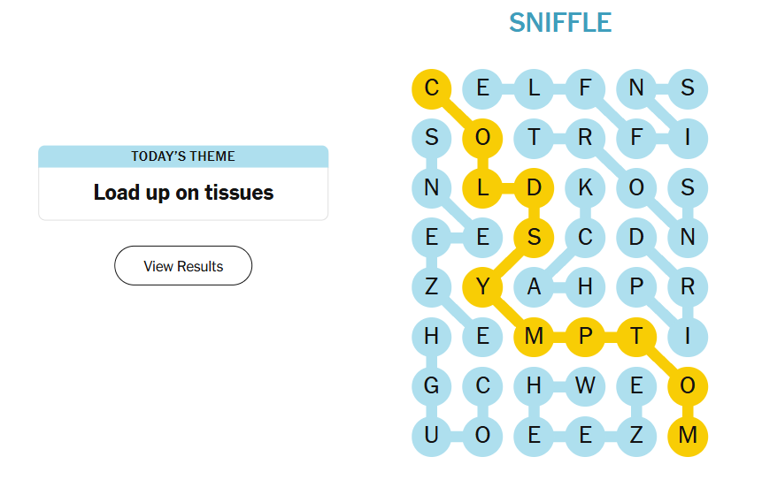 Today’s theme leans into cold and flu season, focusing on the sounds and symptoms no one enjoys. The puzzle felt approachable, with very recognizable words, but still required careful scanning to catch shorter terms tucked between longer ones.