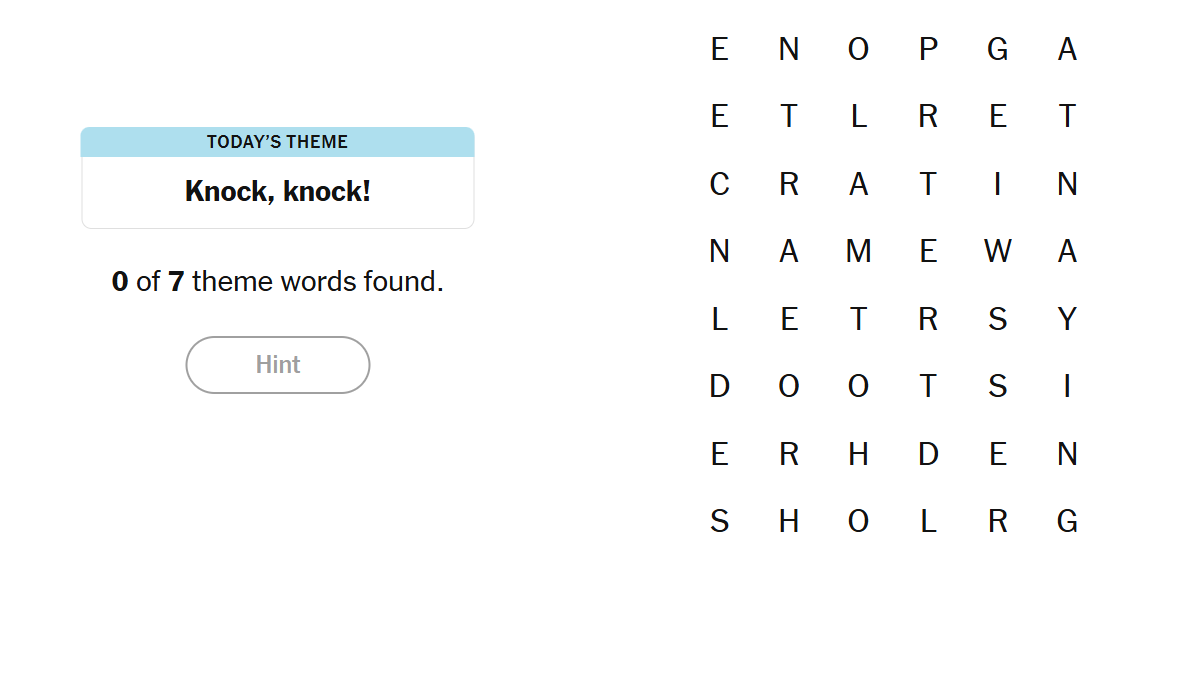 Today’s Strands greeted solvers with a riddle-like charm. The theme Knock Knock hinted at everything related to getting inside — from doors and gates to the very act of stepping through a threshold. It was a warm welcome to a puzzle that played with words of entry and invitation.