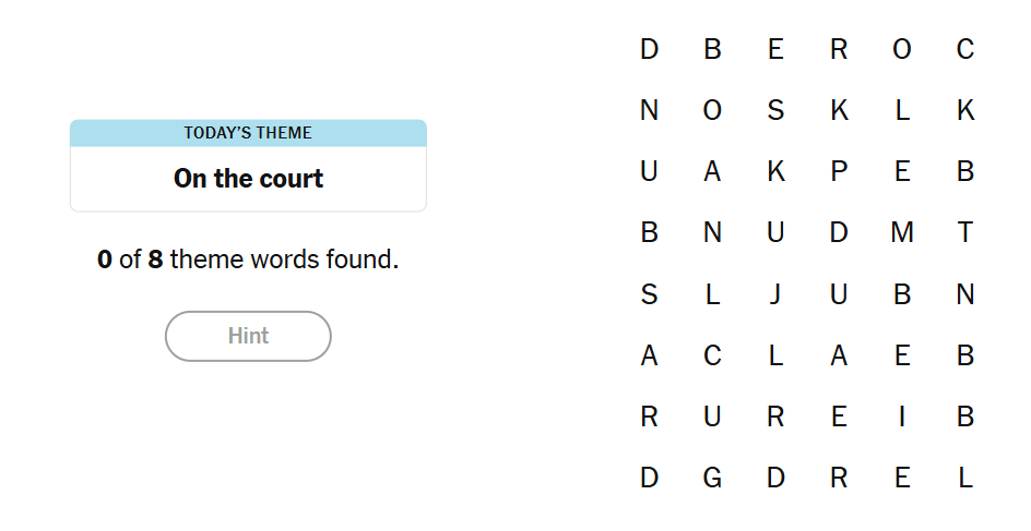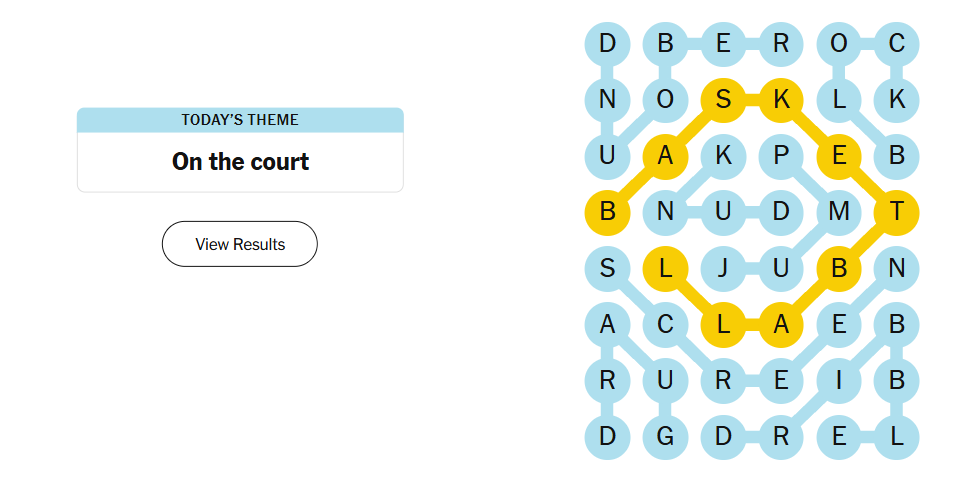 NYT Strands is the New York Times’ daily word-search/word-find style puzzle. Today’s theme was On the court — a collection of basketball-related actions and roles. The puzzle mixed short, punchy verbs with a few positional terms, plus a spangram that tied the list together.