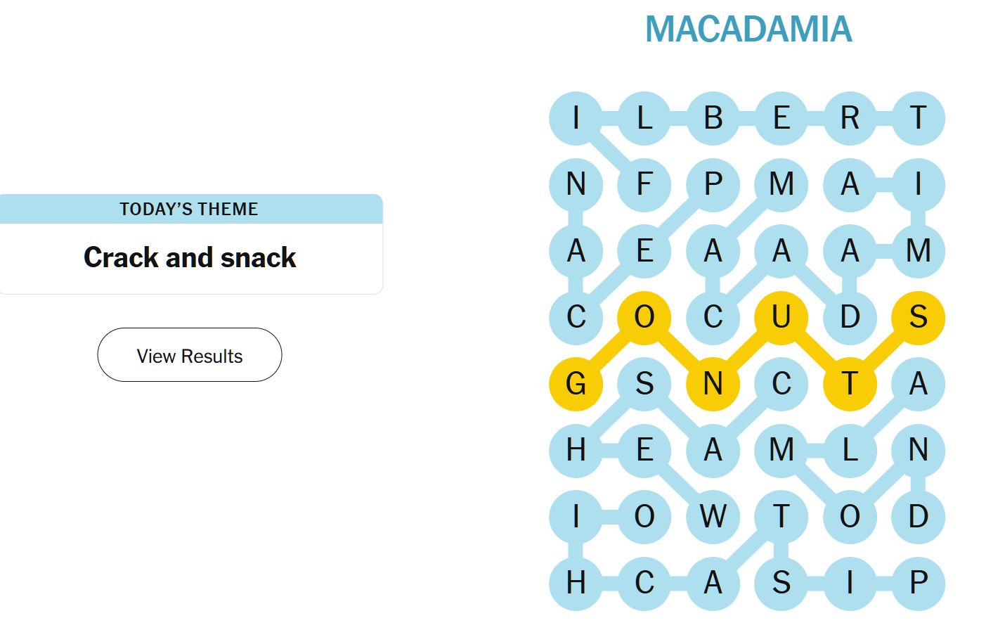 The spangram ties the whole puzzle together: it’s an upbeat phrase that captures the idea of going all-in on these crunchy snacks. Every theme word is a type of nut you might reach for when you decide to “go nuts” on treats, whether in baking, candy, or a simple bowl of mixed nuts.