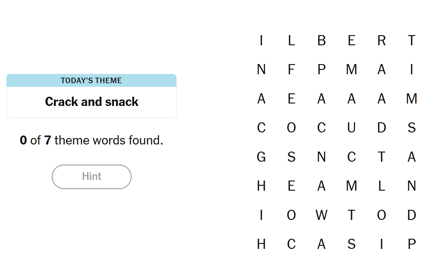 Use hints thoughtfully. They’re especially handy when you have the theme but can’t think of the last one or two words. A single revealed nut today could easily point you toward its neighbors.