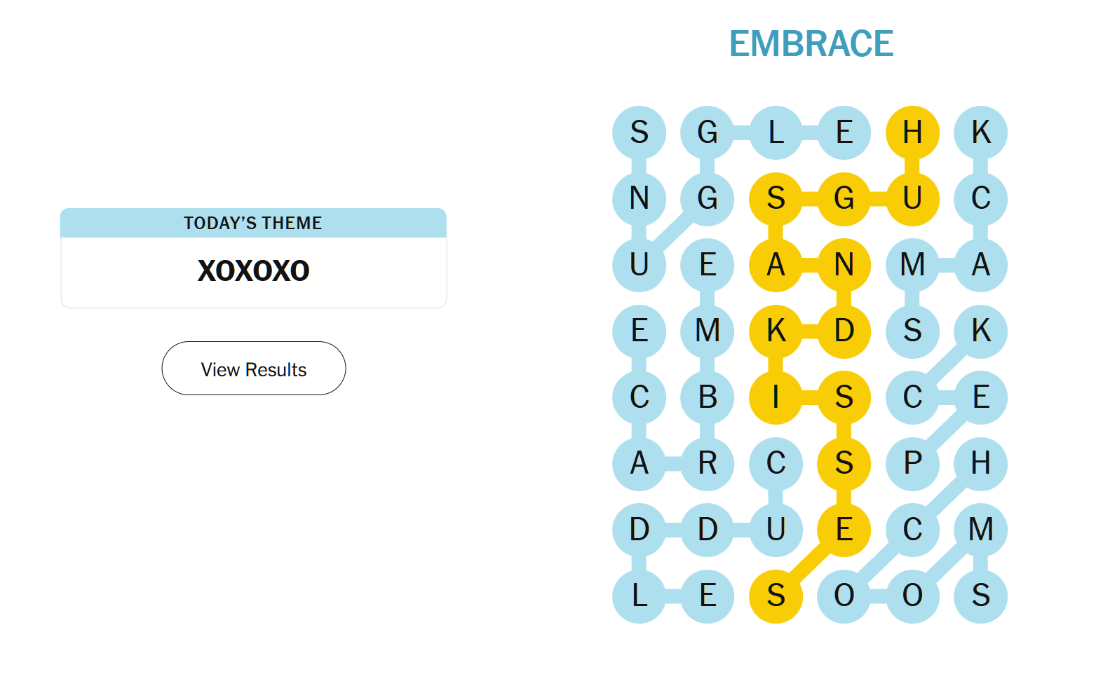 The spangram sums up the puzzle’s loving theme, often symbolized as XOXO in notes and cards, representing squeezes and lip-locks.