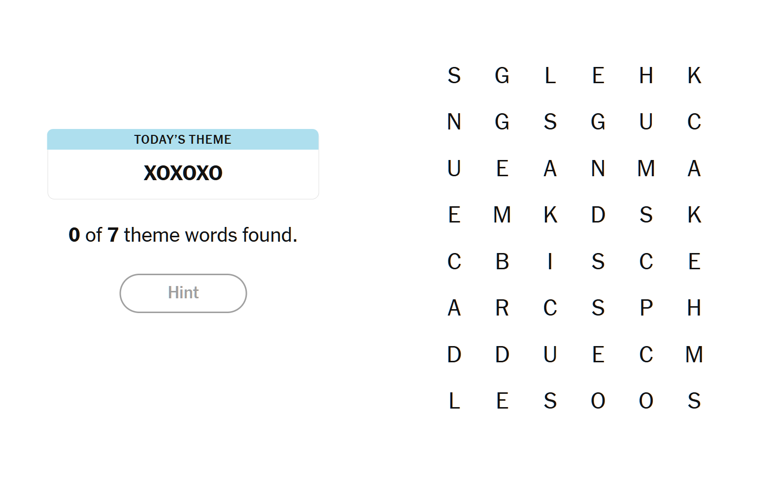The spangram sums up the puzzle’s loving theme, often symbolized as XOXO in notes and cards, representing squeezes and lip-locks.
