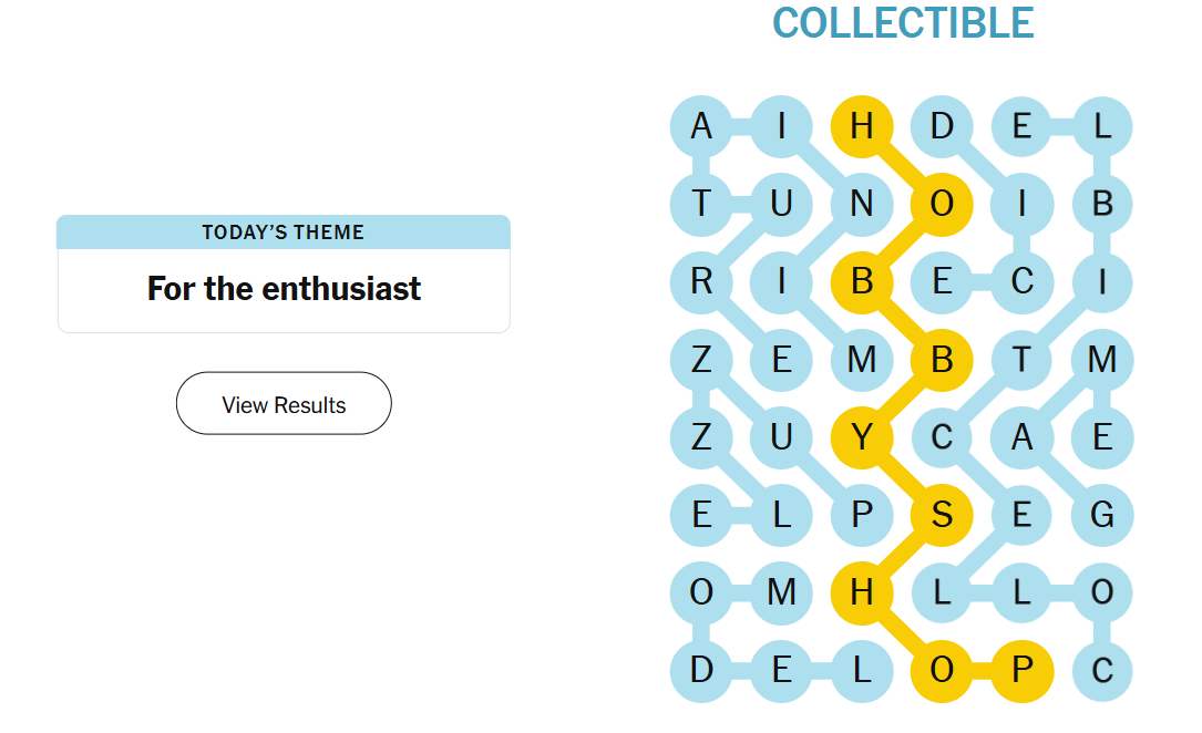 Today’s theme leaned into hobbies and pastimes, focusing on items you’d expect to find in the hands (or on the shelves) of a dedicated fan. The word choices felt friendly and accessible, with a nice balance between short, common terms and longer, more specific ones. The spangram was especially fitting, neatly capturing the shared home of all these interests.