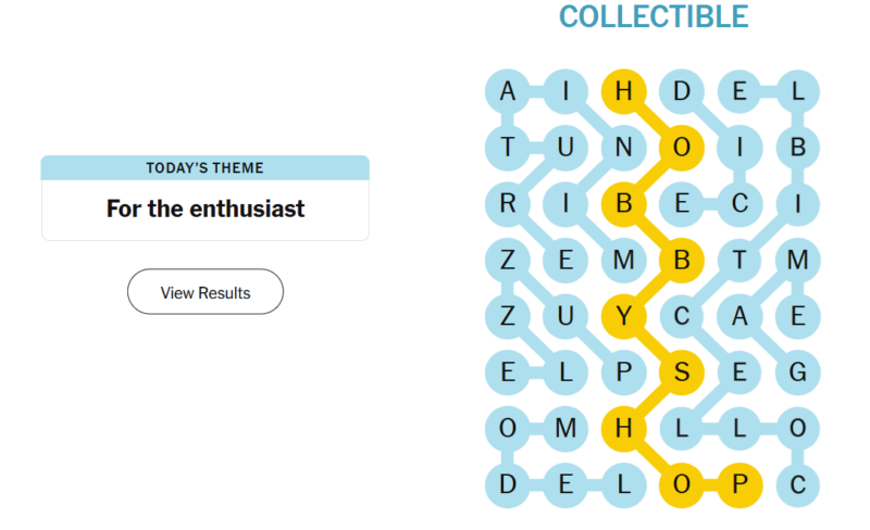 Today’s theme leaned into hobbies and pastimes, focusing on items you’d expect to find in the hands (or on the shelves) of a dedicated fan. The word choices felt friendly and accessible, with a nice balance between short, common terms and longer, more specific ones. The spangram was especially fitting, neatly capturing the shared home of all these interests.