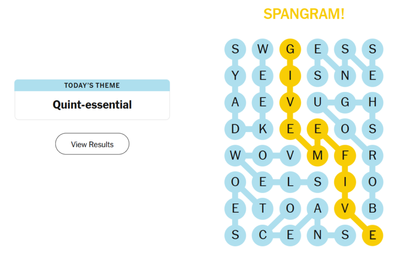 - The spangram ties the idea of “five” together in a playful, phrase-like way.