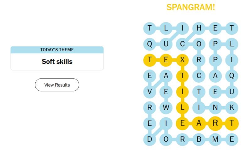 Today’s theme had a playful double meaning. Instead of interpersonal talents, “Soft Skills” pointed to hands-on crafts involving fabric and thread. The puzzle felt approachable, with recognizable words and a spangram that clearly connected all the answers once you spotted it.