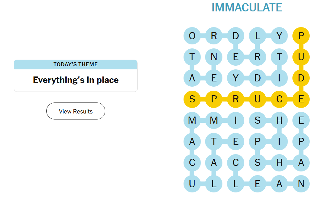 Today’s theme leaned into cleanliness, organization, and that pleasing sense of things being just right. The vocabulary ranged from simple descriptors to slightly more expressive terms, making it approachable but still engaging. The spangram was a fun, upbeat phrase that captured the feeling of transforming a messy space into something polished and presentable.
